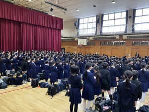 今日は2026年度始業式でした。体育館で新しいクラスごとに整列し、転入生の紹介、新しい担任の先生の発表などがありました。