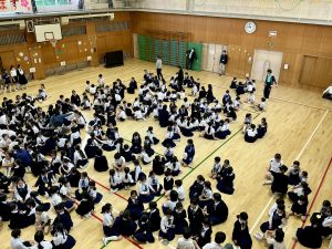 迎える会は6年生が企画し、司会進行も務めました。学校に関するクイズや仲間づくりゲームを通して自己紹介を行い、たくさんのお兄さん、お姉さんと触れ合うことができ、和やかな時間となりました。