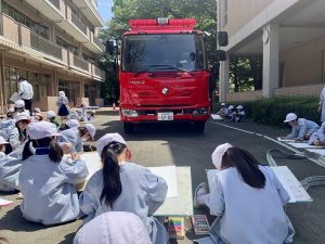 2年生の生活の授業で行われた消防車写生会では、学校に来た消防車を前に、子どもたちが細部までよく観察しながら、真剣に絵を描く姿が印象的でした。