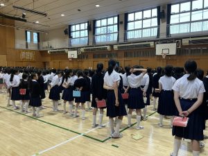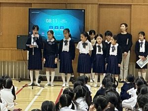 今日の全校朝礼では、役員会の児童からのあいさつがありました。